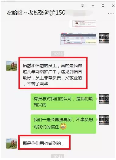 河北农哈哈机械有限公司的张总是一个互联网意识很强的人,市面上的互联网推广产品几乎全部都做过。但自从开始了流量宝合作之后张总表示“信融和信融的员工,真的是我做这几年网络推广中,遇见到信誉最好,员工非常负责,又敬业”。